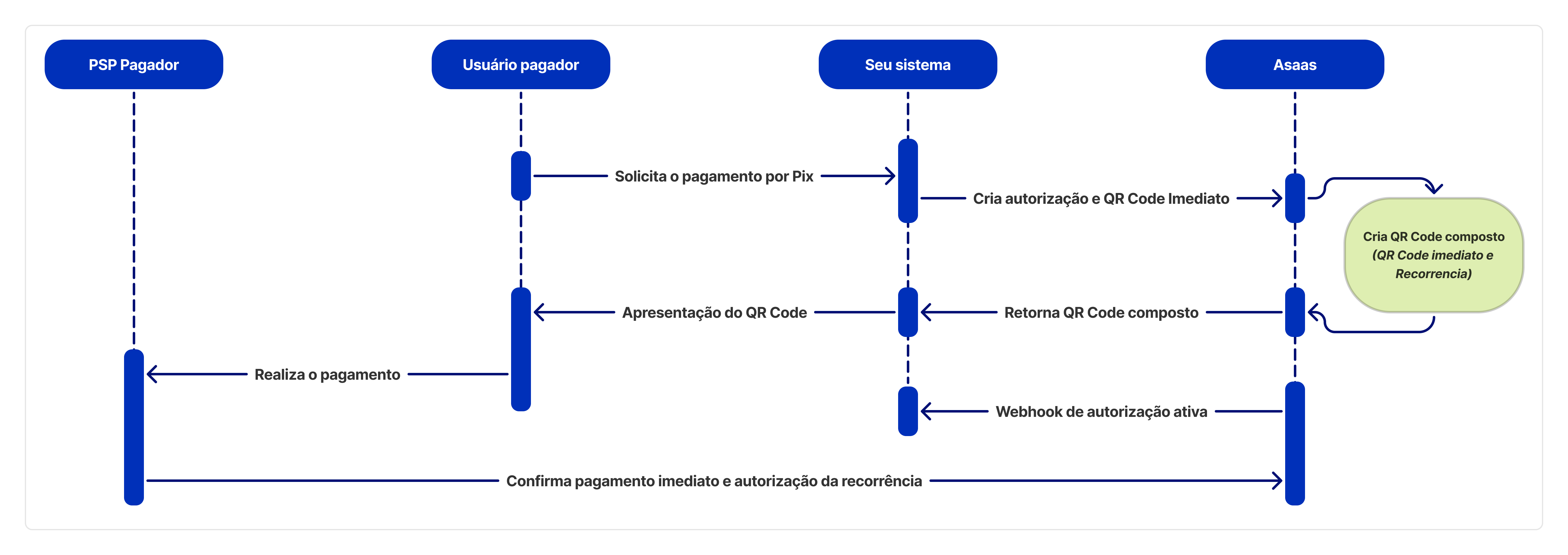 - Geração do QR Code Integrado: Sua aplicação faz a criação da solicitação de autorização, definindo os parâmetros da recorrência. Um QR Code composto é criado.