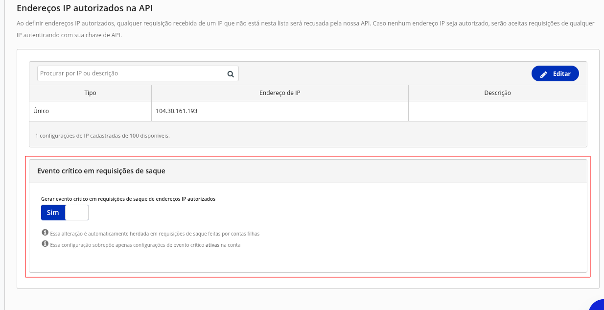 Na tela de configuração de IPs, você encontrará a seção "Evento crítico em requisições de saque".